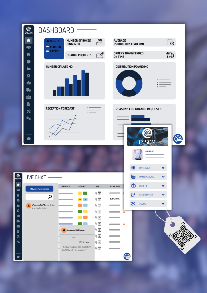 e-SCM si impegna attivamente con i suoi partner. Collaboriamo con attori importanti come BALI Chair, Paris Good Fashion, Global Fashion Agenda e Tricolor Collective per una moda più responsabile. Stiamo collaborando con EuroSIMA e Outdoor Sports Valley per digitalizzare i processi produttivi e rafforzare la tracciabilità dell'abbigliamento sportivo e dei prodotti outdoor. Infine, grazie alla collaborazione con French Tech Pays Basque e ADI Nouvelle-Aquitaine, e-SCM sostiene l’innovazione locale sviluppando al contempo il suo modello economico e la sua presenza internazionale.