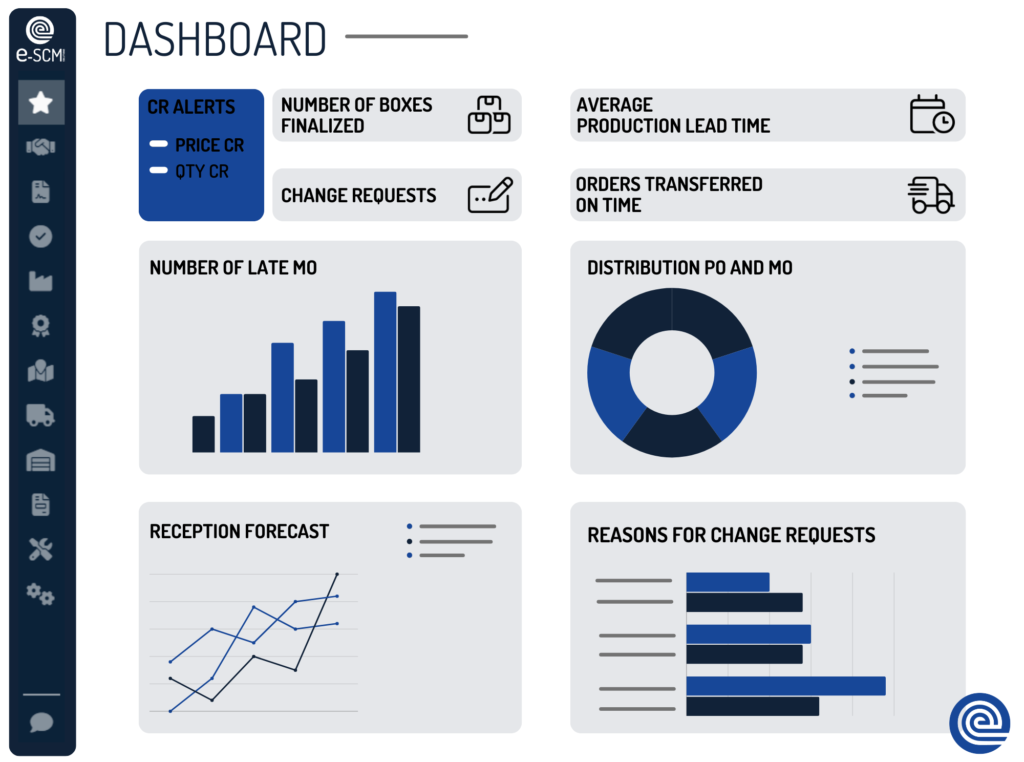 La console di controllo delle soluzioni e-SCM offre dashboard configurabili che consentono di monitorare gli indicatori di performance del ciclo di fornitura del brand. È uno strumento di supporto alle decisioni per l’attuazione delle azioni prioritarie.